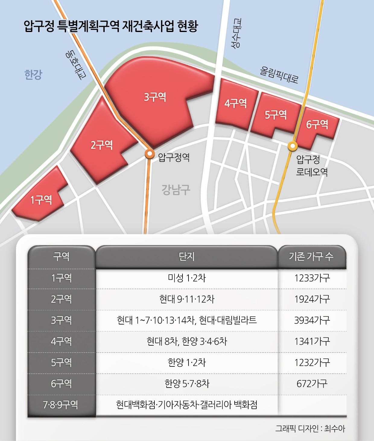 반면 압구정3구역은 같은 날 열린 도시계획위원회 심의에서 정비구역 지정 및 정비계획 결정(변경)안·지구단위계획결정·용도지역결정·경관심의안 보류 판정을 받았다. 조합이 한강의 공공성보다 재건축 사업성을 우선적으로 고려한 건축 계획을 제시해 서울시가 정비계획안에 제동을 건 것으로 풀이된다.