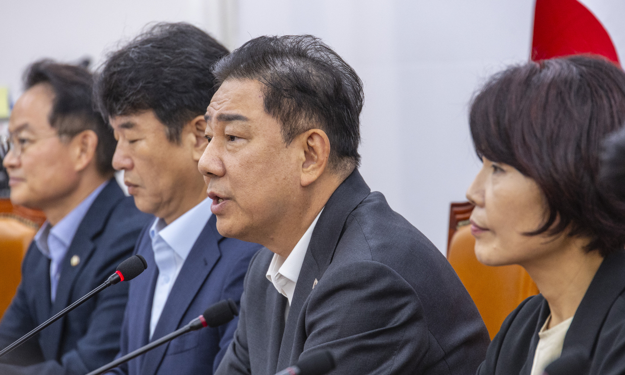 | 김병기(가운데) 더불어민주당 원내대표가 5일 국회에서 열린 원내대책회의에서 발언하고 있다. [연힙] |