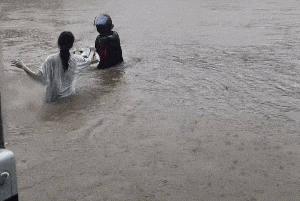 영상에는 허리 높이까지 차오른 물을 헤치고 가게 앞까지 이동해 음식을 픽업한 뒤 다시 오토바이로 돌아가는 배달 기사의 모습이 담겼다.