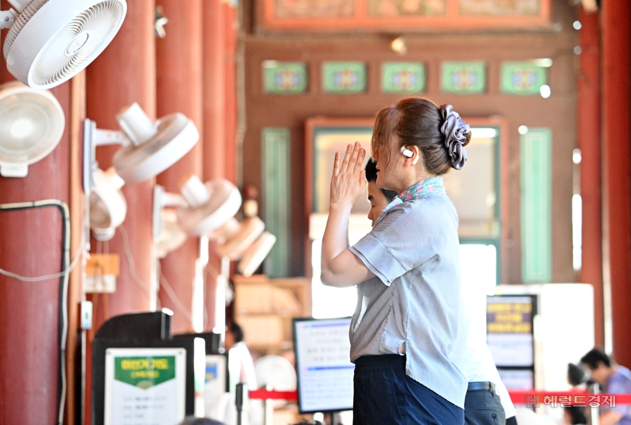 | 2026학년도 대학수학능력시험을 100일 앞둔 5일 오전 서울 종로구 조계사에서 한 신도가 기도를 드리고 있다. 임세준 기자 |