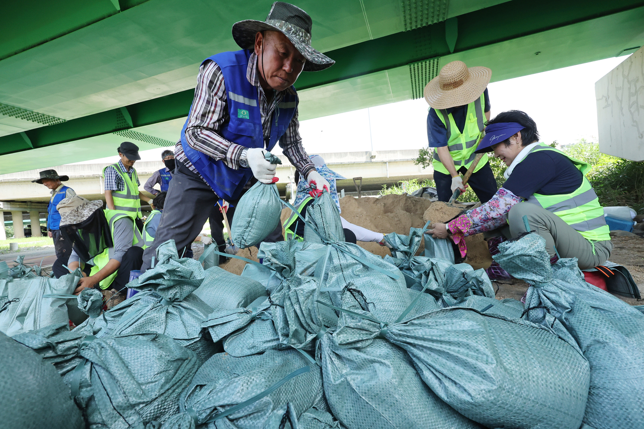 | 5일 오전 광주 북구 동림동 산동교친수공원 주차장에서 작업자들이 침수 예방에 사용할 모래주머니를 만들고 있다. <연합뉴스> |