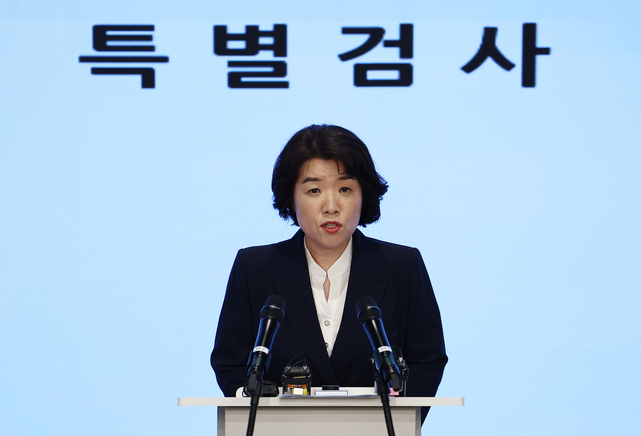 | 윤석열 전 대통령 부인 김건희 여사와 관련한 각종 의혹 사건을 수사하는 민중기 특별검사팀 오정희 특검보가 5일 서울 종로구 광화문kt 웨스트 빌딩에서 브리핑을 하고 있다. [연합] |