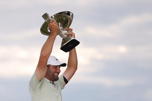 | 지난 시즌 페덱스컵 우승을 차지한 스코티 셰플러가 활짝 웃으며 트로피를 들어 올리고 있다. [게티이미지] |