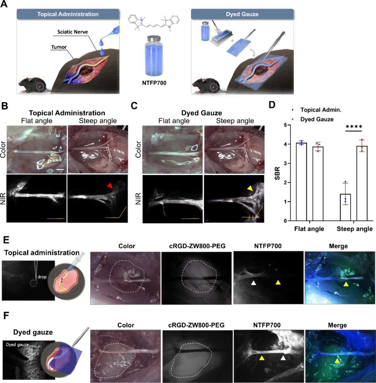 연구팀은 신경 특이적 형광 조영제인 ‘NTFP700’을 새롭게 개발하고, 기존 종양 타깃 조영제 ‘cRGD-ZW800-PEG’과 함께 활용해 700nm 파장에서 신경을 청색 형광으로, 800nm 파장에서 종양을 녹색 형광으로 시각화하는 이중채널 근적외선(NIR) 영상기법을 구현했다. 이 기술은 토끼 좌골신경 주위 종양 모델에 적용해 수술 중 종양과 신경을 동시에 식별하는 데 성공했다. 종양 표지를 위해 cRGD-ZW800-PEG를 수술 4시간 전 정맥 주사해 800nm 채널로 관찰했고, 신경 표지는 NTFP700을 거즈에 흡착시켜 수술 중 700nm 채널로 적용했다.