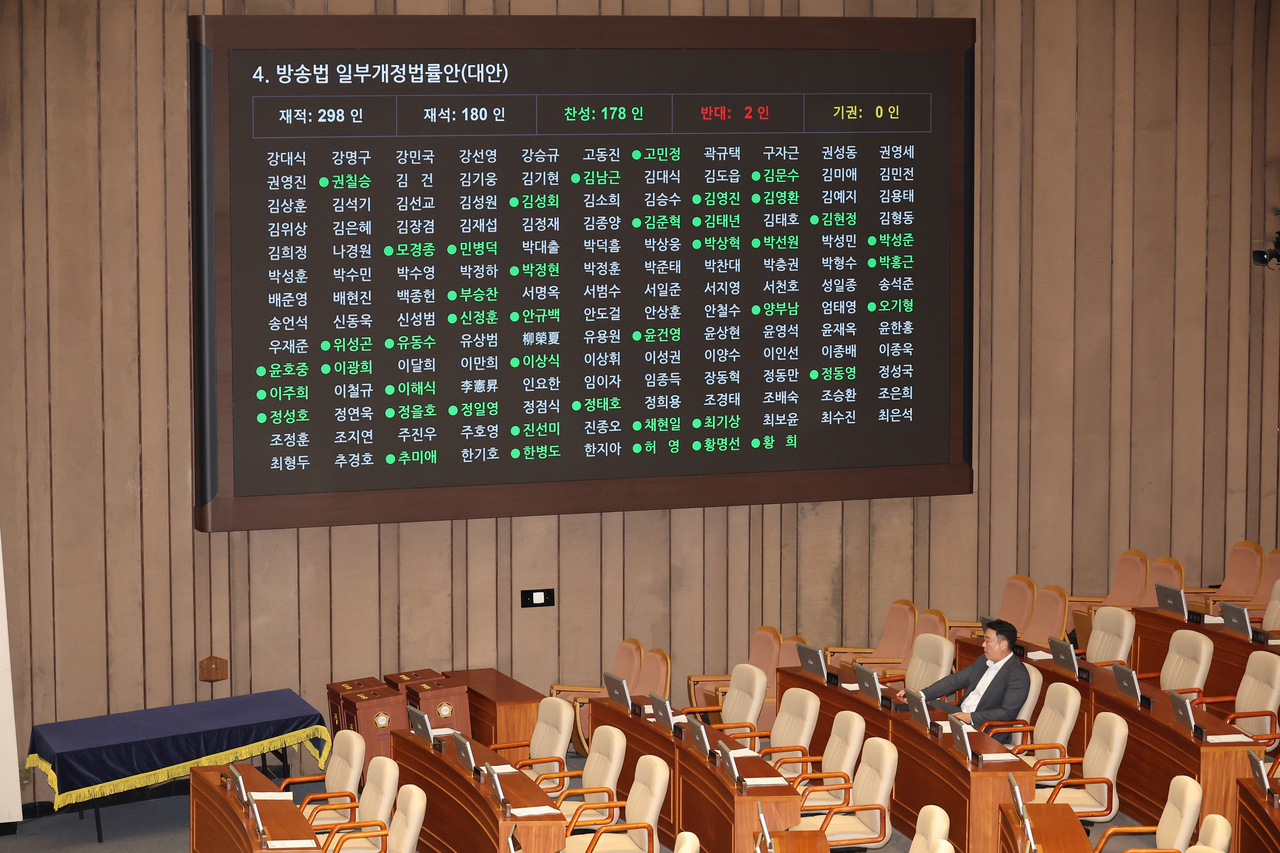 국회는 이날 오후 방송법 개정안을 재석 180명 중 찬성 178명, 반대 2명으로 가결했다. 국민의힘은 표결에 반발해 퇴장했다.