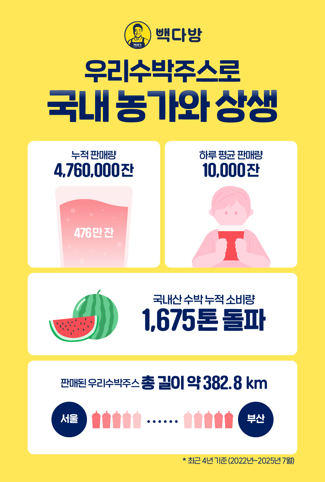 [헤럴드경제=강승연 기자] 더본코리아의 커피전문점 브랜드 빽다방이 여름 한정 메뉴인 ‘우리수박주스’로 최근 4년간(2022~2025년) 사용한 국내산 수박 누적 소비량이 1675톤을 돌파했다고 6일 밝혔다.