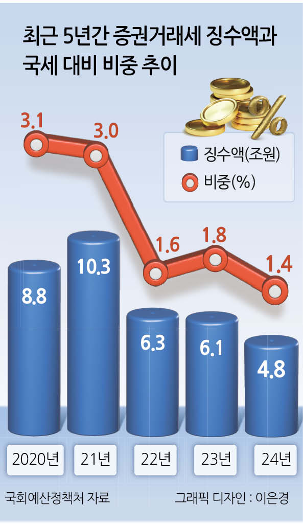 증권거래세 징수액은 ‘동학개미운동’이 한창이던 지난 2021년 10조3000억원까지 늘었지만, 작년 4조8000억원으로 3년 만에 절반 이하로 쪼그라든 바 있다. 유동성 증가세 둔화와 경기 둔화 등으로 증권거래 규모가 감소한 데 증권거래세율 인하까지 덧붙여진 게 요인으로 꼽힌다.