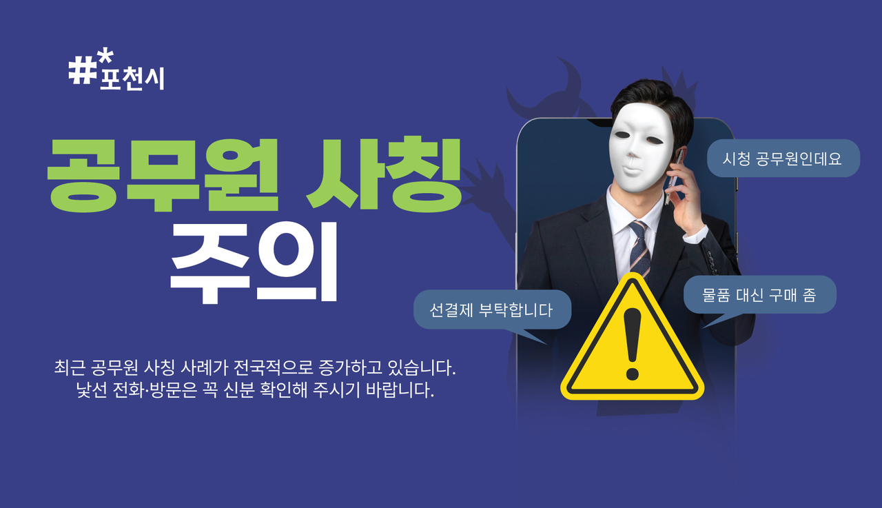 [헤럴드경제=박준환 기자]포천시(시장 백영현)는 최근 공무원을 사칭한 물품 구매 사기 행위가 재차 발생함에 따라, 시민과 관내 업체들에 각별한 주의를 당부했다.