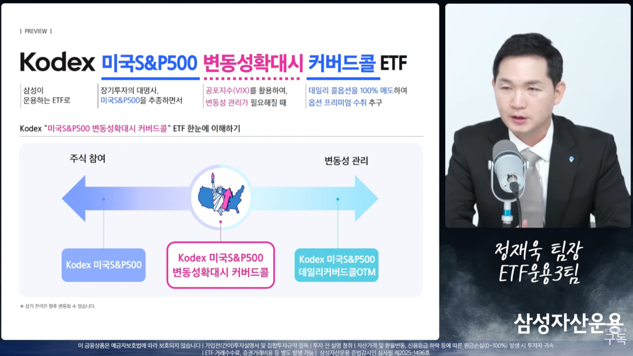 삼성자산운용 측은 7일 웹세미나를 개최하고 “스마트한 변동성 관리로 장기 S&P500 투자의 효율성을 제고할 수 있을 것”이라고 강조했다. 아울러 “무조건적인 커버드콜이 아닌, 시장 상황에 따라 전략을 자동으로 온·오프하는 구조”라며 “장기 투자자들에게 보다 효율적인 수익 구조를 제공할 수 있다”고 말했다.