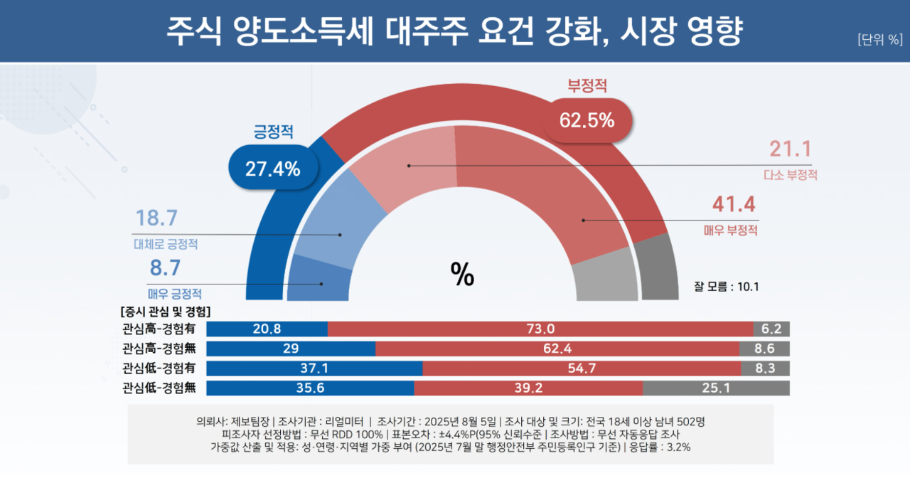 [헤럴드경제=한지숙 기자] 최근 정부가 발표한 주식 양도소득세 과세 대상 대주주 요건을 종목 당 50억원에서 10억원으로 낮춘 세제 개편안을 두고 국내 주식 시장에 부정적 영향을 미칠 것이라고 예상한 여론조사 응답자가 60% 이상인 것으로 나타났다.