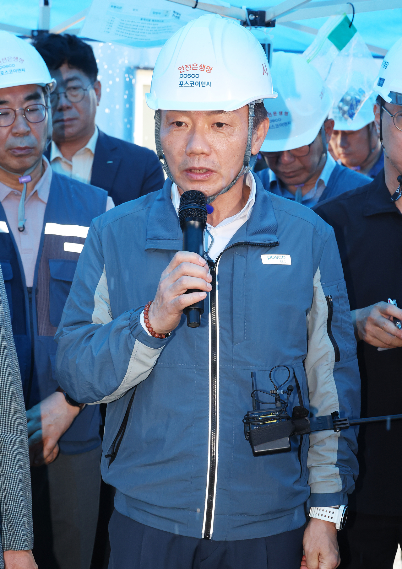 | 6일 송치영 포스코이앤씨 사장이 작업자가 중상을 입고 의식불명에 빠진 사고가 발생한 경기도 광명시 포스코이앤씨 고속도로 건설공사 현장에서 더불어민주당 을지로위원회 위원들의 질의에 답하고 있다. [연합] |