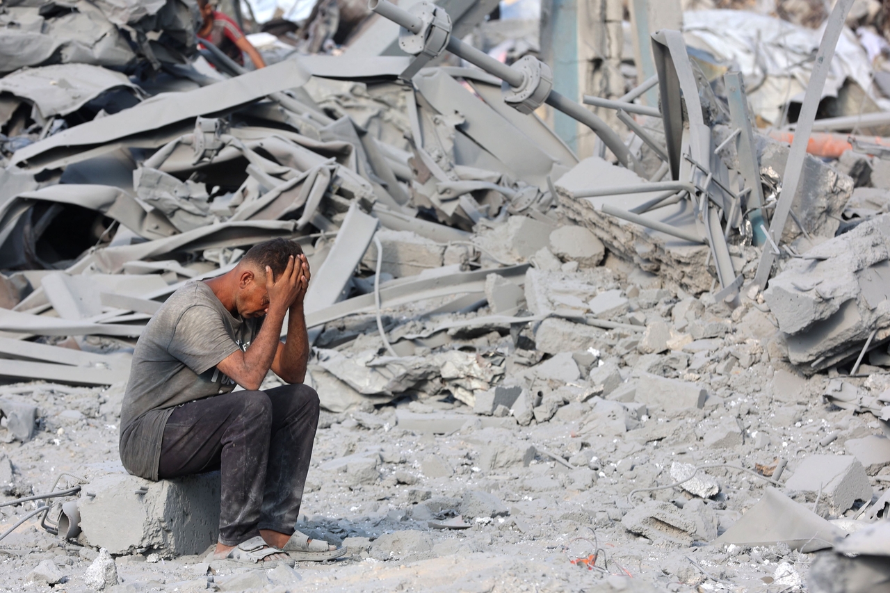 | 팔레스타인 한 남성이 6일(현지시간) 이스라엘군의 가자지구 북부 공습으로 파괴된 셰이크 라드완 보건센터 앞에서 절망하고 있는 모습 [AFP] |