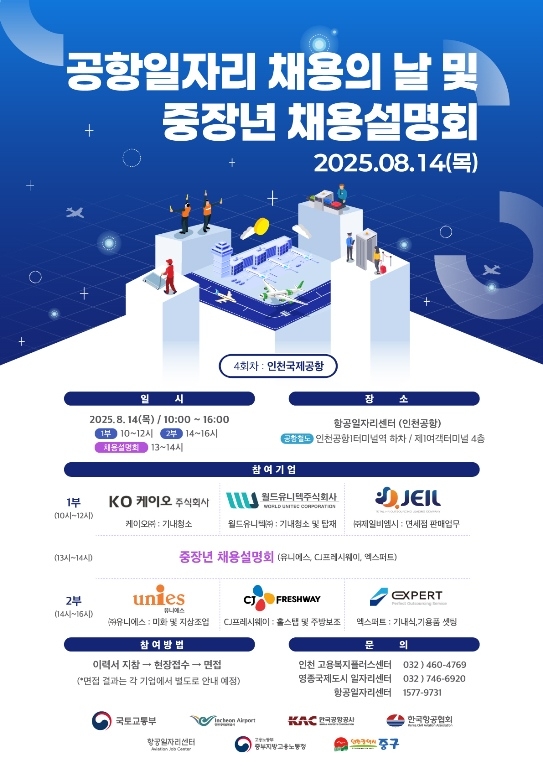 인천 중구와 중부지방고용노동청, 항공일자리센터가 협업해 행사를 운영하고 케이오주식회사, 월드유니텍주식회사, ㈜제일비엠시, ㈜유니에스, 씨제이프레시웨이주식회사, ㈜엑스퍼트 총 6개 기업이 참여한다.