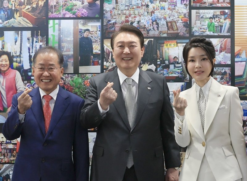 | 지난 2023년 4월 윤석열 당시 대통령과 부인 김건희 여사가 대구 서문시장 인근에서 열린 ‘서문시장 100주년 기념 특별사진전’을 찾아 홍준표 당시 대구시장과 기념촬영하는 모습. [대통령실] |