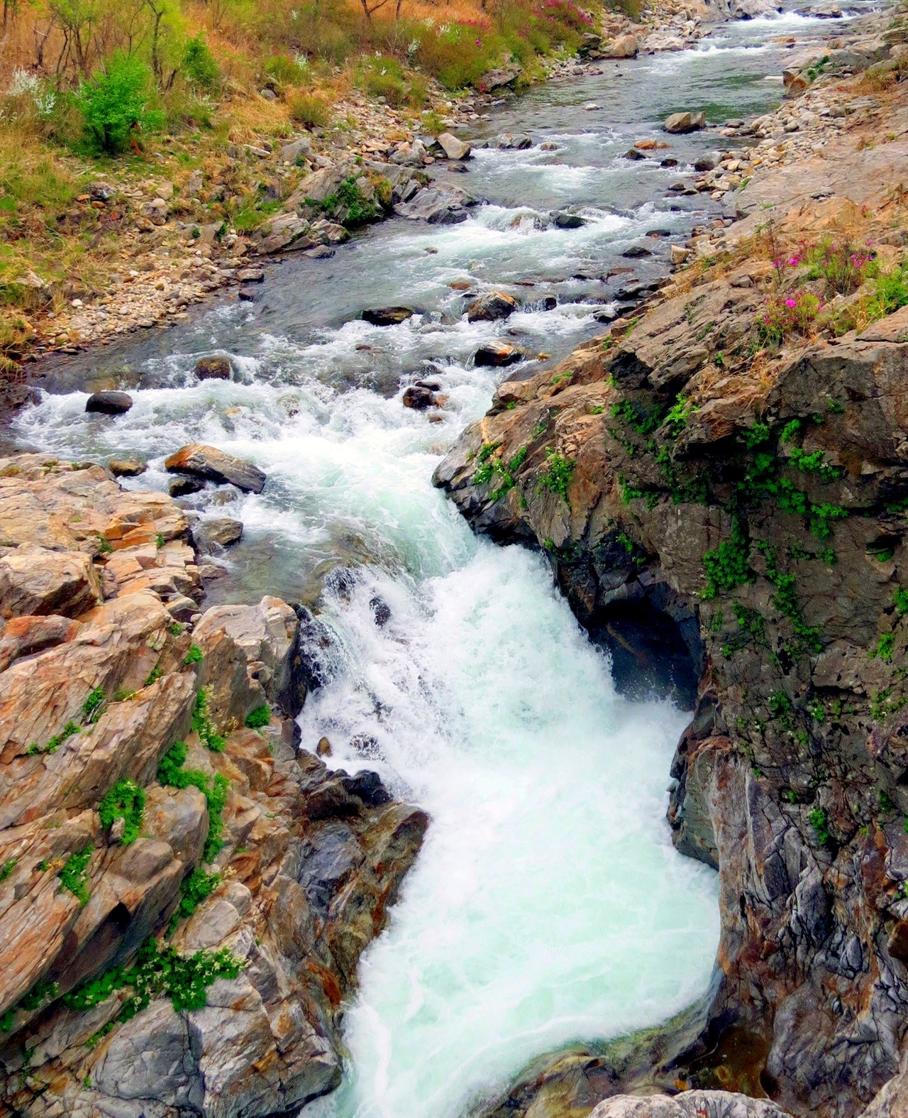 | 양구 두타연. 전망대에서 보면 한반도 모양의 계곡과 폭포 모습이 나타난다.[함영훈 기자] |