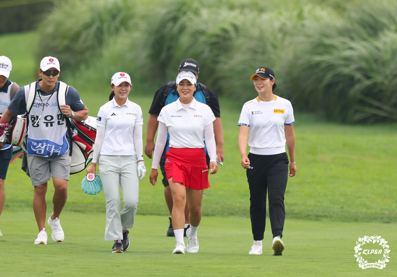 | 제주삼다수 마스터스 1라운드에서 동반플레이한 황유민(왼쪽부터)과 윤이나, 방신실이 밝은 표정으로 이야기를 나누며 걷고 있다. [KLPGA 제공] |