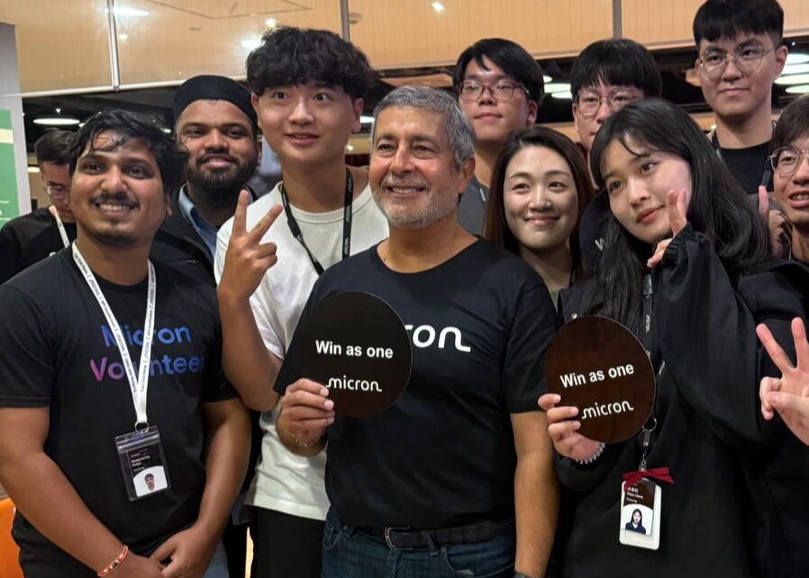 | 산자이 메흐로트라 마이크론 최고경영자(CEO)가 최근 마이크론 세미컨덕터 한국 사무소를 찾아 직원들과 기념촬영하는 모습. [산자이 메흐로트라 SNS] |