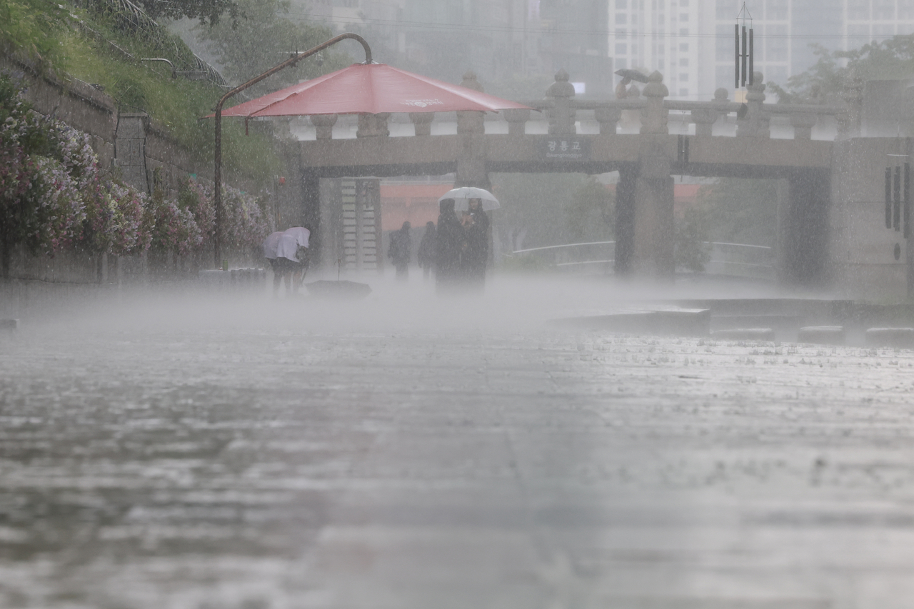 | 8일 서울 청계천에 소나기가 쏟아지고 있다. [연합] |