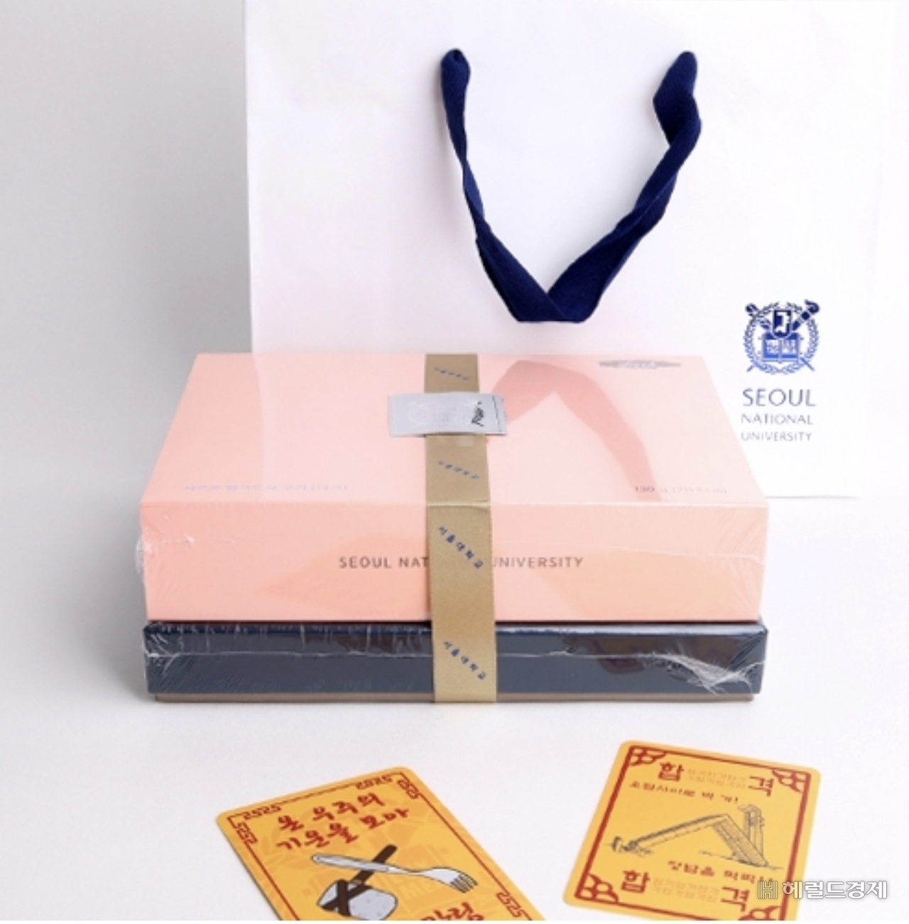 | 서울대학교 온라인 기념품샵에서 판매중인 초콜릿·쿠키·부적 세트. [서울대학교 기념품샵 갈무리] |