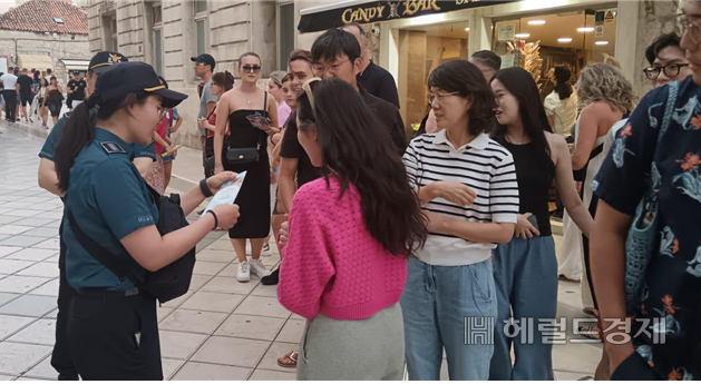 | 크로아티아에 파견된 수원서부경찰서 강수연 경사(사진 왼쪽)가 현지 관광지인 스플리트에서 한국인 관광객들을 대상으로 안전여행 홍보 활동을 하고 있다. [경찰청 제공] |