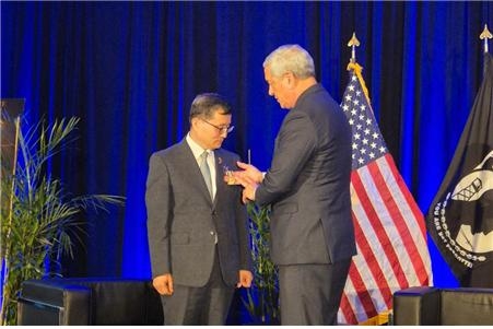 | 지난 7일(현지시간), 미국 버지니아주 르네상스 알링턴 캐피탈 뷰 호텔에서 열린 한국전/냉전 참전 유가족 초청행사에 참석한 이근원 국방부유해발굴감식단장이 켈리 맥케그 미 DPAA 국장으로부터 민간부문 공로훈장을 수여받고 있다. [국방부 제공] |