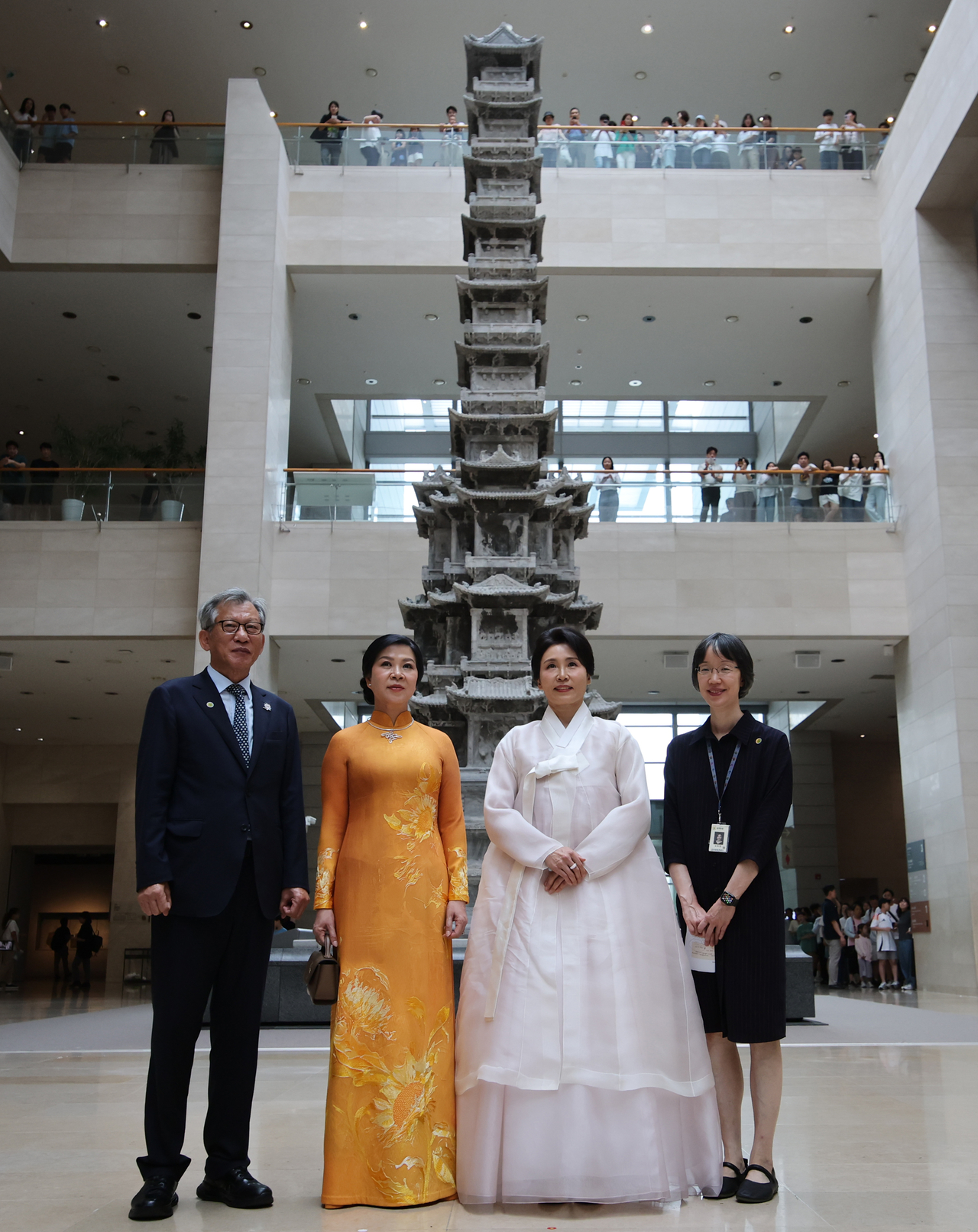 | 김혜경 여사와 또 럼 베트남 당 서기장의 배우자 응오 프엉 리 여사가 11일 서울 용산구 국립중앙박물관에서 기념촬영을 하고 있다. 유홍준(왼쪽부터) 관장, 프엉 리 여사, 김혜경 여사, 김혜원 박물관 미술부장. [연합] |