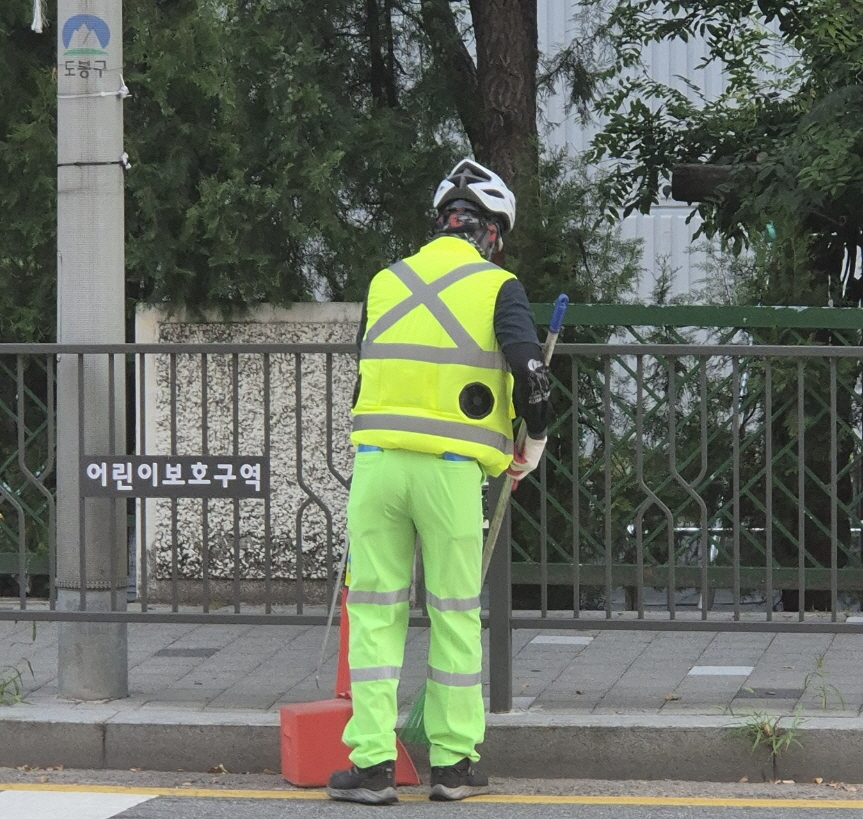 | 선풍기 조끼 입은 청소 근로자 |