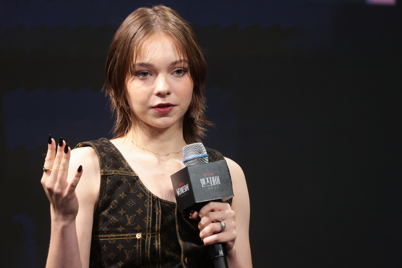 | 배우 에마 마이어스가 11일 서울 종로구 포시즌스호텔에서 열린 넷플릭스 시리즈 ‘웬즈데이’ 시즌2 내한 기자간담회에서 질문에 답하고 있다. [연합] |