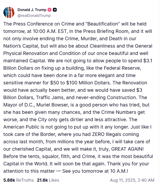 그는 워싱턴DC에 대해 “텐트, 불결함, 범죄가 생기기 전에는 세계에서 가장 아름다운 수도였다”며 “곧 다시 그렇게 될 것”이라고 말했다. 또 “뮤리엘 바우저 워싱턴 DC 시장은 노력해온 좋은 사람이지만, 여러 번 기회를 부여받았음에도 범죄 수치는 악화되었고, 도시는 점점 더 더럽고 매력 없게 변했다. 미국 국민은 더 이상 이를 참지 않을 것”이라고 지적했다.