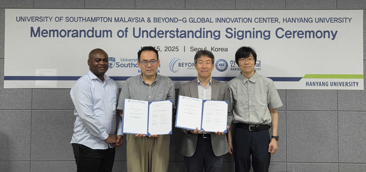 [헤럴드경제=김용재 기자] 한양대학교 Beyond-G 글로벌 혁신센터(센터장 김선우 교수)는 지난달 15일 말레이시아 사우스햄턴 말레이시아 대학(University of Southampton Malaysia, 이하 UoSM)과 차세대 통신 기술 공동연구를 위한 업무협약(MOU)을 체결했다고 12일 밝혔다.