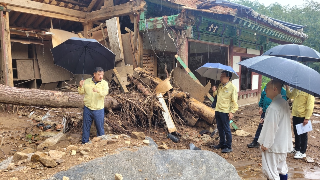 | 박명균 경남도 행정부지사가 지난 11일 산청 율곡사와 정취암 등 피해 현장을 방문해 복구 상황을 점검했다. [경남도 제공] |