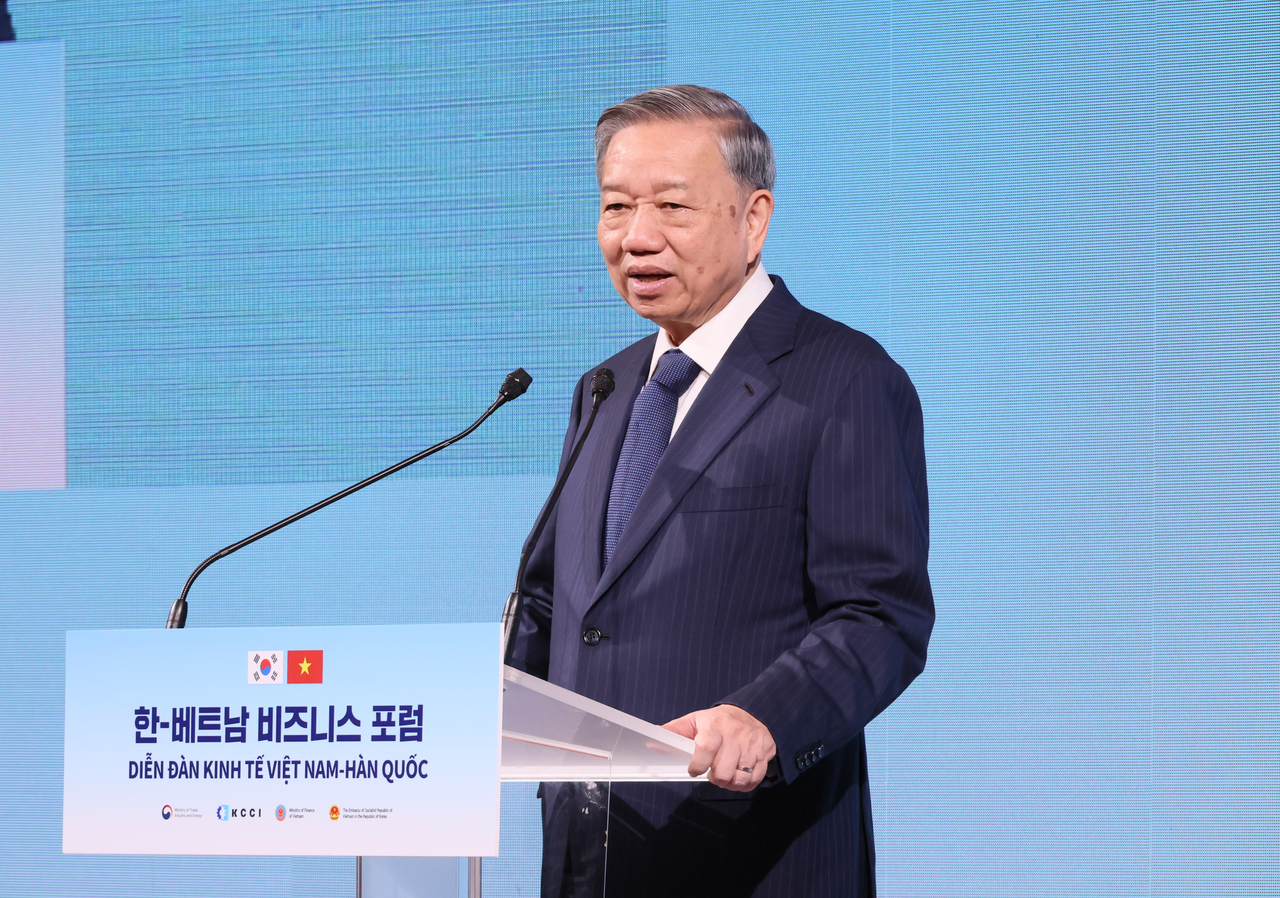 | 또 럼 베트남 당 서기장이 12일 서울 중구 롯데호텔에서 열린 한-베트남 비즈니스 포럼에서 기조연설을 하고 있다. [연합] |