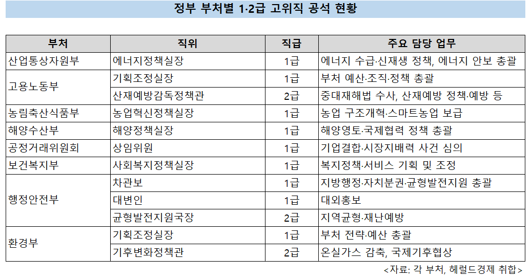 12일 헤럴드경제 취재를 종합하면 현재 산업통상자원부·고용노동부·농림축산식품부·해양수산부·공정거래위원회·보건복지부·행정안전부·환경부 등에서 1·2급 고위직 열 세 자리가 비어 있다. 이 중 1급 실장·상임위원이 10명, 2급 국장이 3명이다.