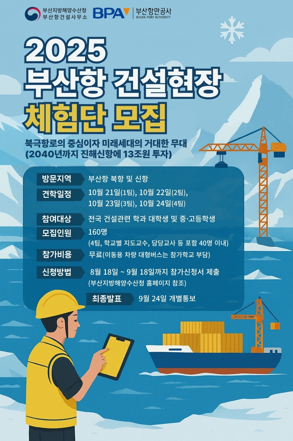 [헤럴드경제(부산)=홍윤 기자] 부산지방해양수산청(부산해수청) 부산항건설사무소와 부산항만공사는 13일 건설 관련 학과 대학생과 미래 건설·물류 전문가를 꿈꾸는 중·고등학생을 대상으로 ‘2025년 부산항 건설·운영 현장 체험단’ 참가자를 모집한다고 밝혔다.