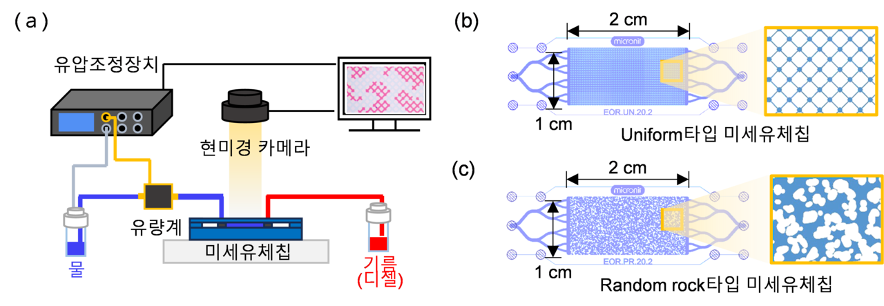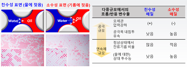 한국과학기술연구원(KIST) 물자원순환연구단 이승학, 정재식, 김상현 박사 연구팀은 미세한 유체 흐름을 정밀하게 관찰할 수 있는 ‘미세유체 시스템’을 이용해 다양한 조건의 다공성 매질 내에서 기름과 물이 어떻게 상호 작용을 하는지에 대해 관찰했다. 특히 실제 지하수 흐름과 유사한 일정한 압력 차 조건에서 실험을 수행한 결과 소수성 표면에서는 기름이 쉽게 빠져나갔으며, 반대로 친수성 표면에서는 더 많은 기름이 남는 경향이 관측됐다. 이러한 관측 결과를 비혼성 대체 서로 섞이지 않는 두 가지 유체가 압력 차이로 서로를 밀어내는 과정 해석 모델로 증명했다.