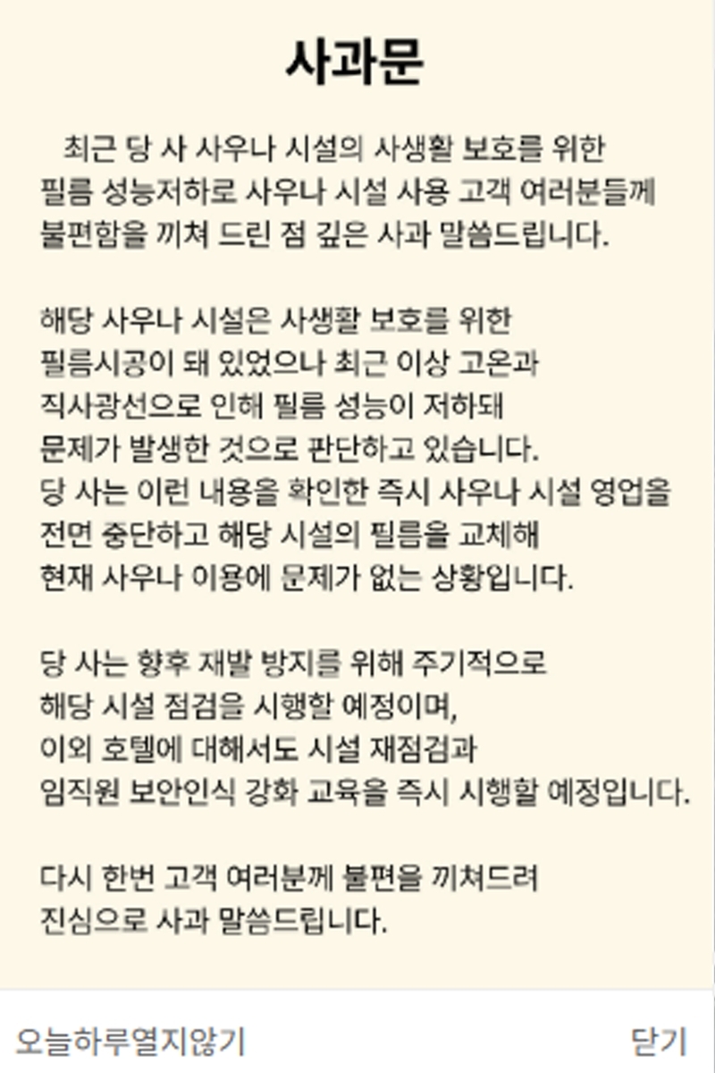 호텔 측은 사과문에서 “사우나 시설은 사생활 보호를 위한 필름이 시공돼 있으나 최근 이상 고온과 직사광선으로 성능이 저하돼 문제가 발생한 것으로 판단한다”며 “이 내용을 확인한 즉시 사우나 시설 영업을 중단하고 필름을 교체했다”고 설명했다.