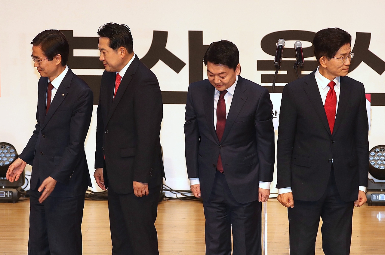 | 12일 오후 부산 해운대구 벡스코에서 열린 국민의힘 부울경 합동연설회에서 당대표 후보들이 단상에 오르고 있다. 왼쪽부터 조경태, 장동혁, 안철수, 김문수 후보. [연합] |
