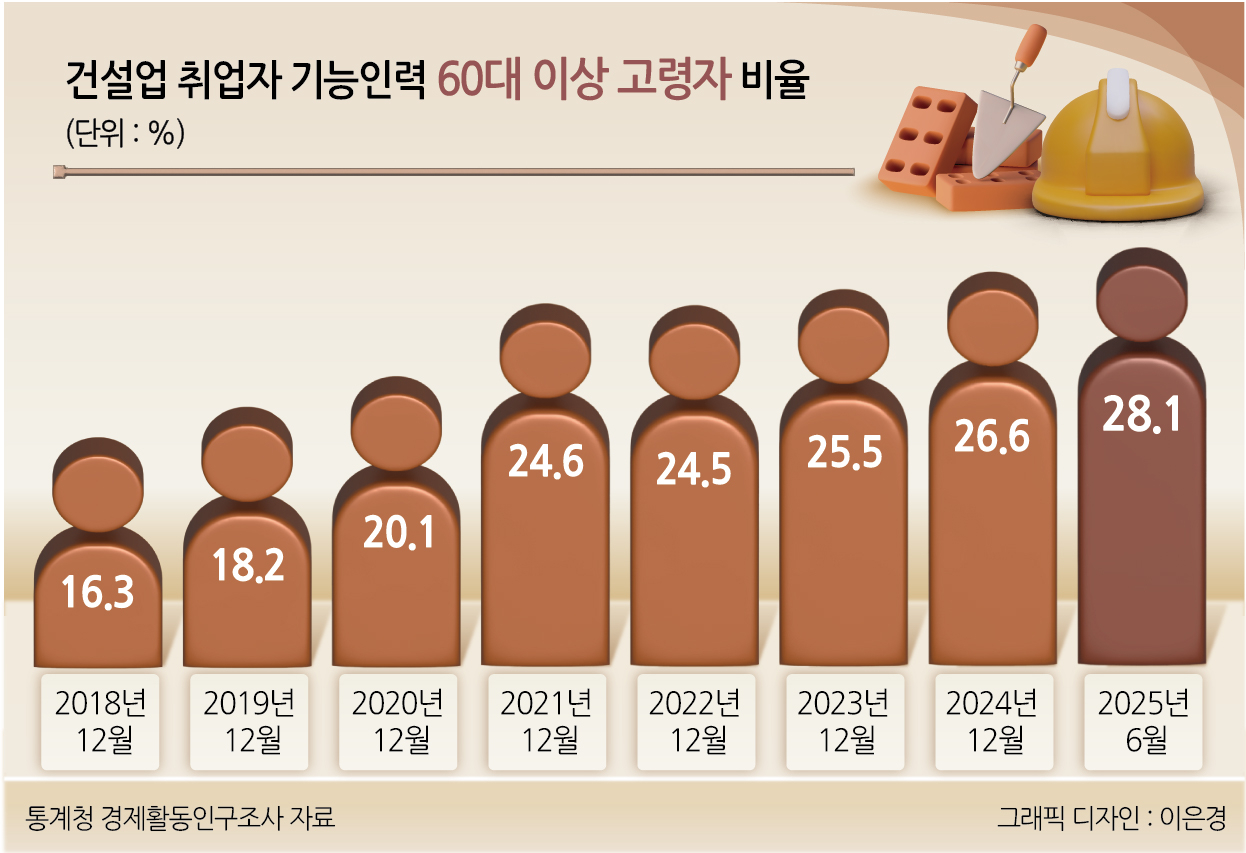 건설 근로자의 평균 연령은 ‘확’ 높아지고 있다. 건설근로자공제회의 ‘건설기성 및 건설기능인력 동향’에 따르면 작년 12월 말 기준 건설기능인력 중 60대 이상 비율은 26.6%로 2018년 말(16.3%)보다 10.3%포인트 높아졌다. 처음 통계 집계를 시작한 2001년 12월(6.6%)과 비교하면 증가 폭은 20%포인트에 이른다.