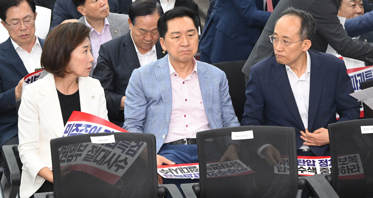 | 국민의힘 나경원(왼쪽부터), 김기현, 추경호 의원이 14일 서울 여의도 중앙당사에서 열린 긴급 의원총회에 참석해 대화하고 있다. [공동취재] |