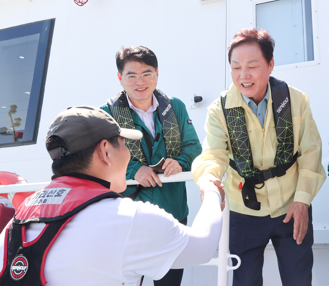 | 박완수 도지사가 14일 거제 해상 가두리양식장을 찾아 고수온 피해 최소화를 위한 대응 상황을 점검하고, 어업인들을 격려했다. [경남도 제공] |