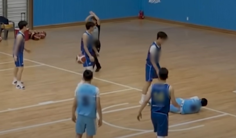 | 한국중고등학교 농구연맹이 주최한 ‘2025 한국중고농구 주말리그 왕중왕전’에서 리바운드 경합 중 폭행을 당한 뒤 쓰러져 있는 선수 [온라인 커뮤니티] |