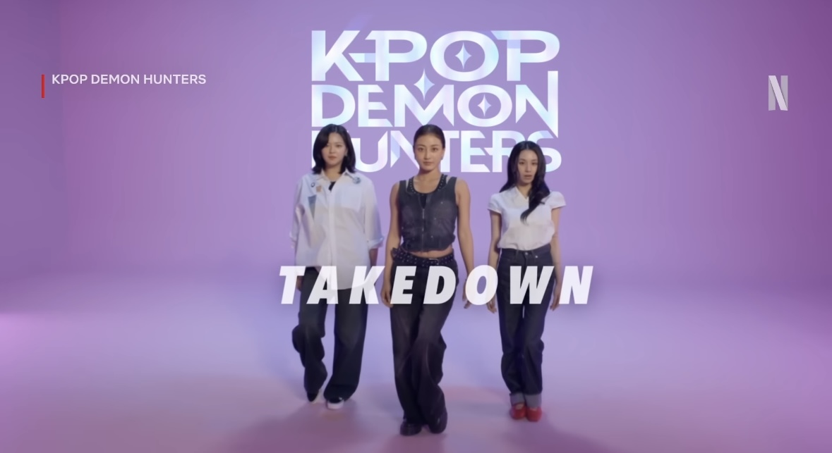 | 트와이스의 케이팝 데몬 헌터스 OST ‘TAKEDOWN’ 뮤직비디오. 왼쪽부터 트와이스 정연, 지효, 채영. [넷플릭스 유튜브 캡쳐] |
