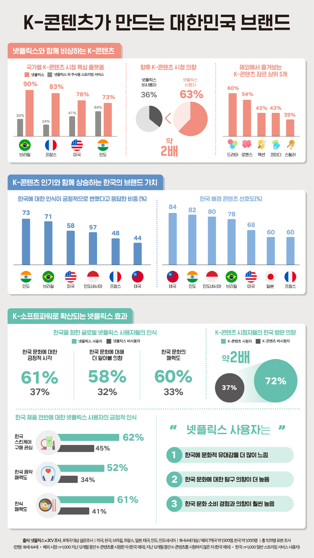 실제 넷플릭스가 한국, 브라질, 프랑스, 미국, 인도, 인도네시아, 태국, 일본 등 ‘K-콘텐츠’ 확장력이 높은 8개 국가의 약 1만1000여 명을 대상으로 조사한 결과, 넷플릭스 사용자의 11%는 ‘K-콘텐츠’를 평균보다 2배 이상 시청하는 ‘수퍼 팬(Super Fan)’인 것으로 나타났다.