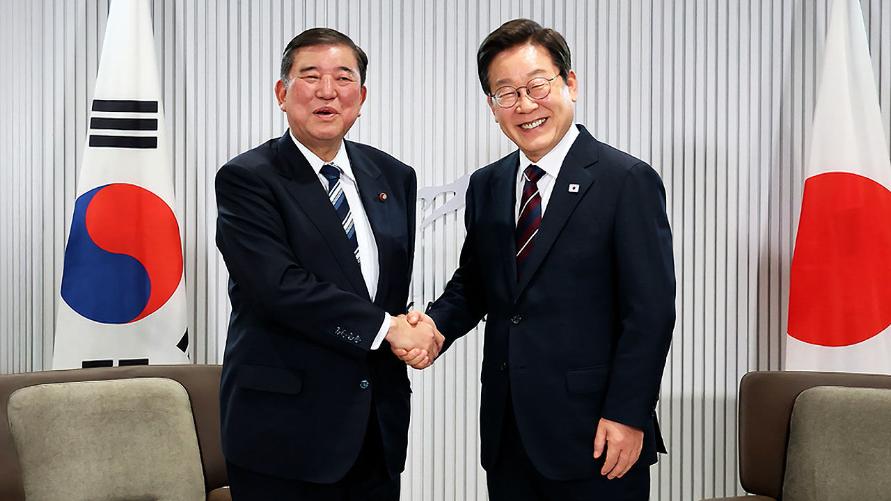 이재명 대통령이 지난 6월 캐나다 앨버타주 캐내내스키스 주요 7개국(G7) 정상회의장에서 이시바 시게루 일본 총리와 한·일 정상회담을 하고 있다. (대통령실 제공