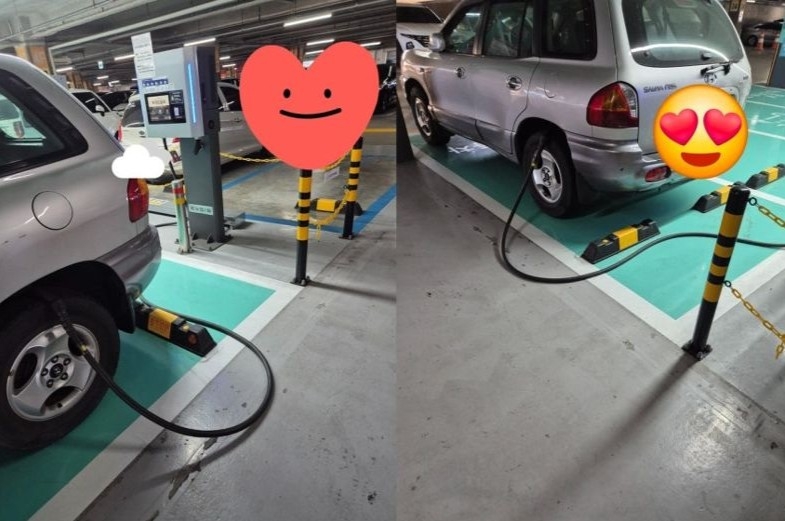 [헤럴드경제=최원혁 기자] 전기차가 아닌 구형 SUV 차주가 바퀴 위에 충전선을 올려놓은 채 전기차 충전 구역에 주차한 사진이 공개됐다.