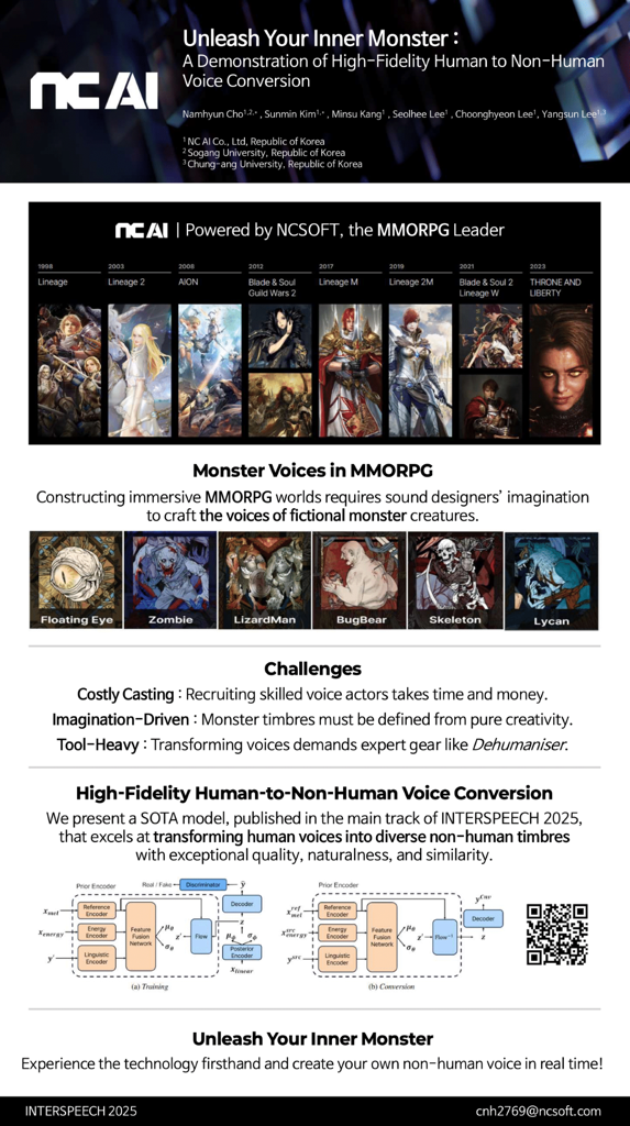 NC AI는 이번 학회에서 몬스터 사운드에 특화된 고품질 음색 변환 모델의 구조와 학습 기법을 상세히 다룬 논문과, 이를 웹 기반 실시간 변환 시스템으로 구현한 데모 구축 사례 논문 등 총 2편을 발표한다.