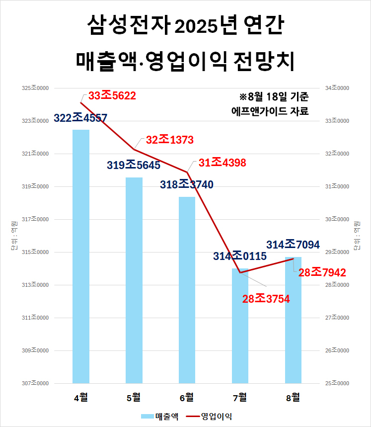 18일 금융정보업체 에프앤가이드에 따르면 국내 증권사들이 제시한 올해 삼성전자 연간 영업이익 전망치 컨센서스는 28조7942억원으로 집계됐다. 지난 7월 기준 28조3754억원과 비교했을 때 1.48% 상승한 수치다.