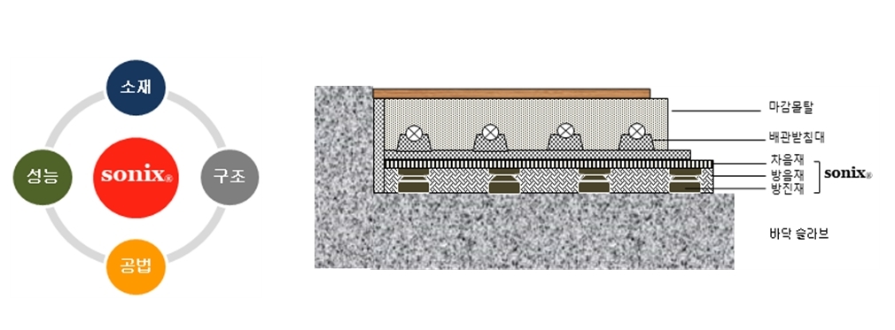 소닉스시스템은 포스코이앤씨와 기술협력으로 강화된 층간소음법의 신법기준 국내 최초로 경량ㆍ중량충격음 모두 1등급을 획득한 ‘소닉스 Anwoollim U40-A 시스템’(LH제24-22호)을 공동 개발했다. 해당 시스템은 기존 경량기포콘크리트를 사용하지 않아 공기 단축이 가능하며, 바닥마감 온돌층을 70mm로 약 2배로 두껍게 설계해 구조적 안정성도 강화한 것이 특징이다. 이는 기존의 획일화된 시공 방식에서 벗어난 혁신적 사례로 평가받고 있다.