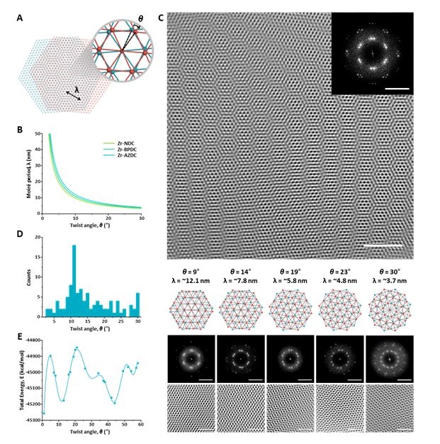 연구팀은 지르코늄(Zr) 기반의 종이처럼 얇은 MOF층(layer) 만들고, 위아래의 MOF 층이 엇갈릴 수 있도록 다른 각도로 겹쳐 쌓았다. 투과전자현미경으로 관찰한 결과, 두 MOF 층의 엇갈린 각도와 유기 분자의 길이 등에 따라 무늬의 형태와 주기가 달라지는 것을 실제로 확인했다.