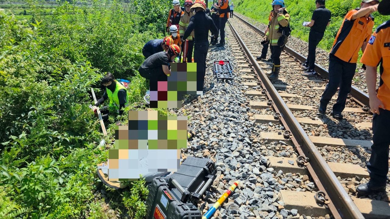 | 19일 오전 경북 청도군에서 무궁화호 열차가 경부선 철로 점검을 위해 주변에 있던 근로자 7명을 잇따라 치는 사고가 발생했다. 이 사고로 근로자 2명이 숨지고 5명이 중경상을 입었다. [경북소방 제공] |